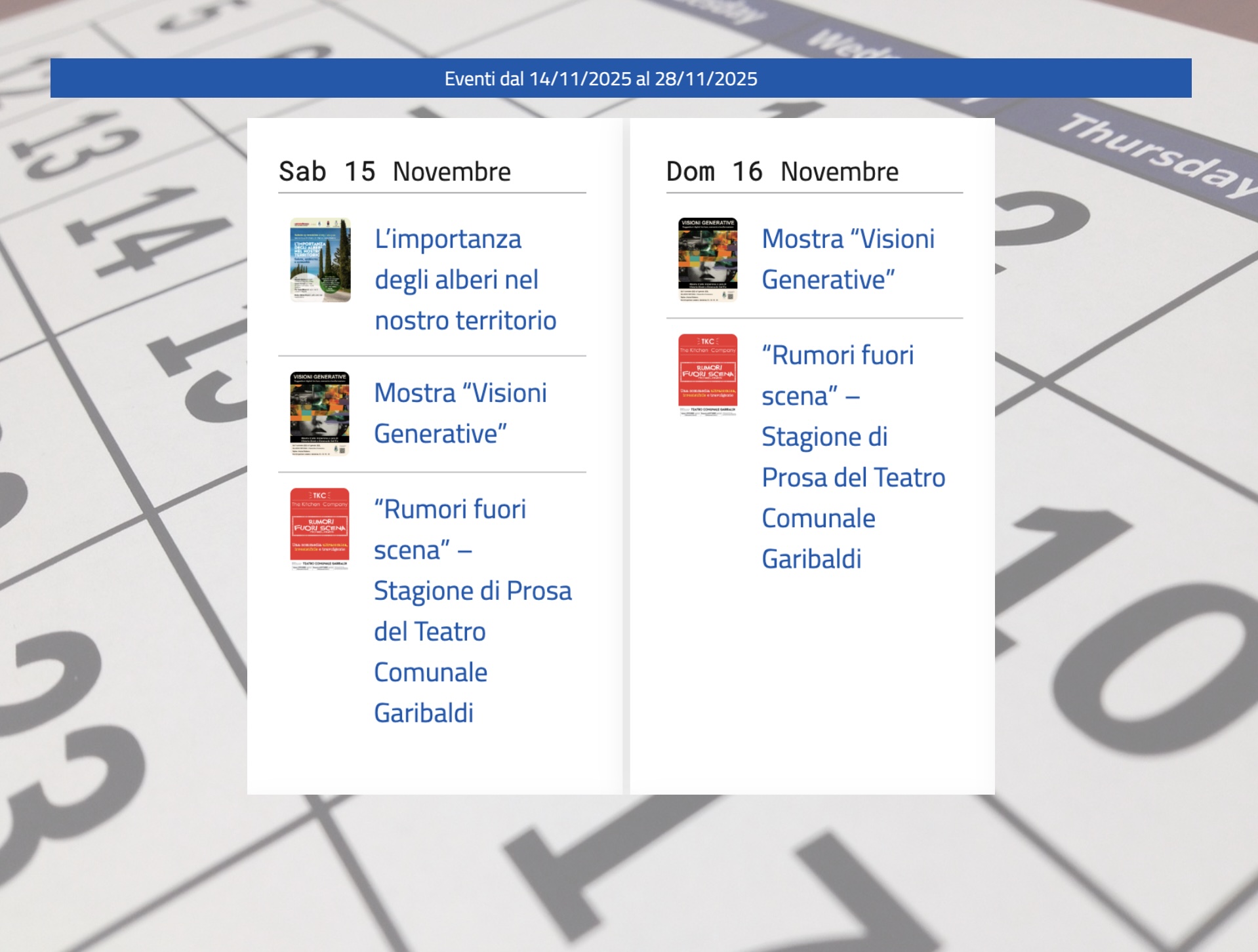 Infine, sabato 15 novembre alle 21 e domenica 16 novembre, alle ore 16,30, al Teatro Comunale Garibaldi si terrà uno spettacolo della stagione di prosa 2025/2026 con la messa in scena di “Rumori fuori scena” di Michael Frayn, a cura di The Kitchen Company. Si tratta di una commedia inglese pluripremiata e amatissima, considerata un vero capolavoro del genere per il suo ritmo travolgente e la comicità incontenibile. Divisa in tre atti, offre uno sguardo brillante e ironico sul mondo del teatro: dalla prova generale caotica, al dietro le quinte di una replica in tournée, fino alla centesima rappresentazione che degenera in modo esilarante. L’appuntamento di sabato è dedicato agli abbonamenti del turno B, mentre quello di domenica al turno D. Per i non abbonati sono disponibili i biglietti alla biglietteria del Teatro Garibaldi (aperta nei tre giorni precedenti la data dello spettacolo dalle 9,30 alle 12,30 e dalle 16 alle 19), nei punti vendita Box Office Toscana e sulla piattaforma online di TicketOne.
