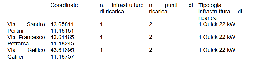 In particolare, la proposta riguarda la realizzazione di tre infrastrutture di ricarica, per un totale di sei punti di ricarica complessivi, da localizzare secondo quanto contenuto in tabella: