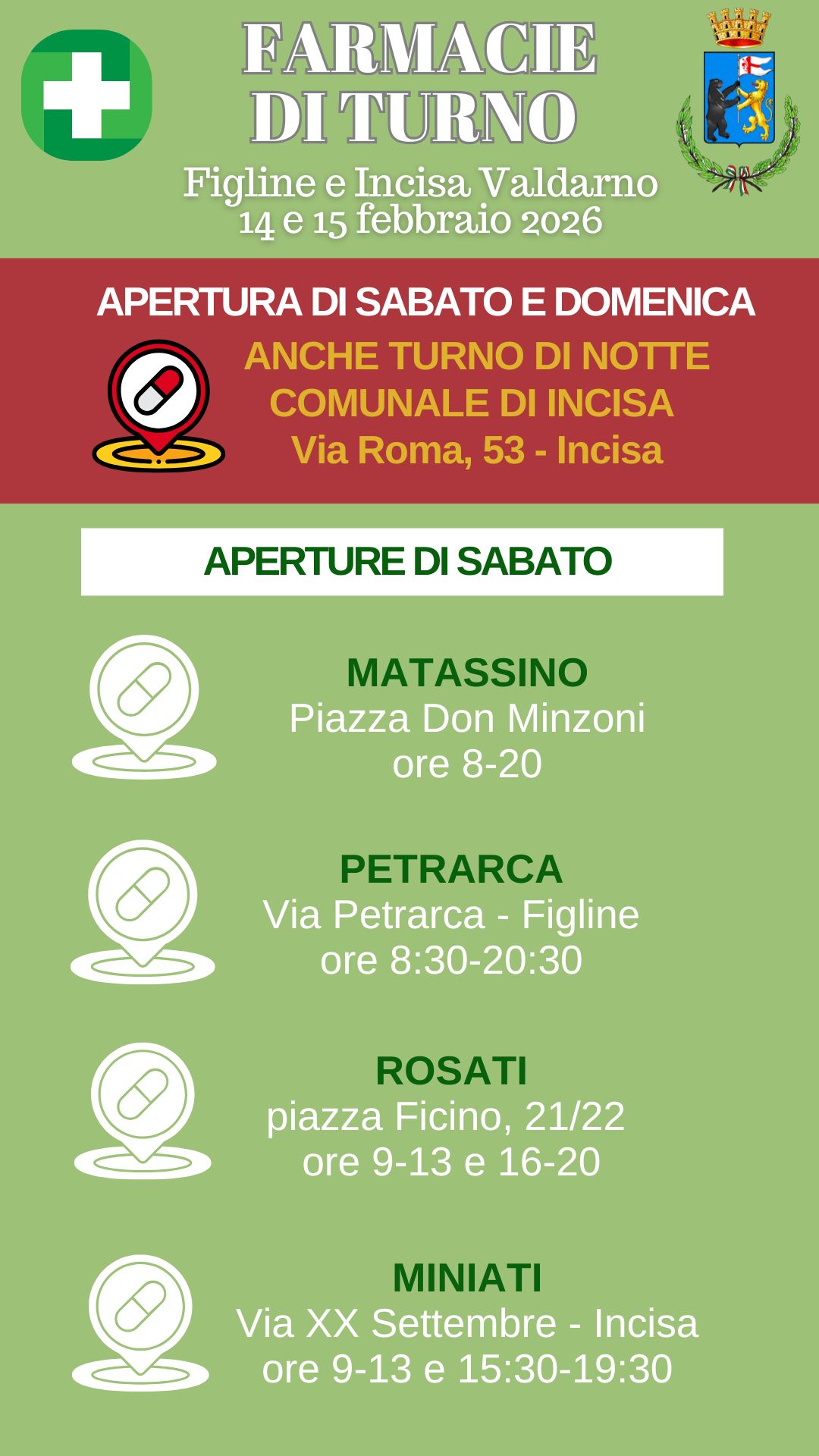 I turni delle farmacie del 14 e 15 febbraio a Figline e Incisa Valdarno