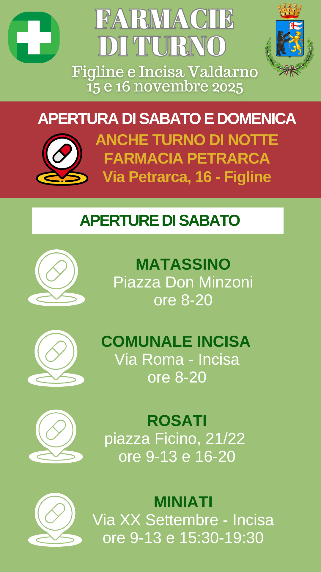 Ecco di seguito le farmacie di turno aperte il fine settimana del 15 e 16 novembre a Figline e Incisa Valdarno.
