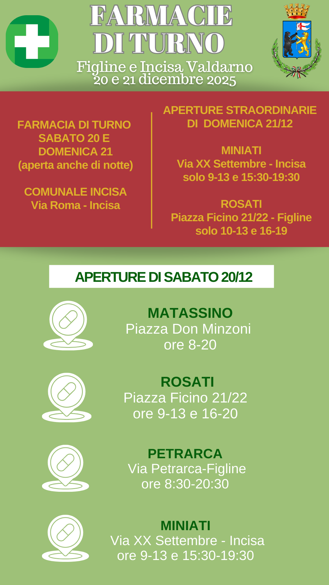 Ecco di seguito le farmacie di turno aperte il fine settimana del 20 e 21 dicembre a Figline e Incisa Valdarno.