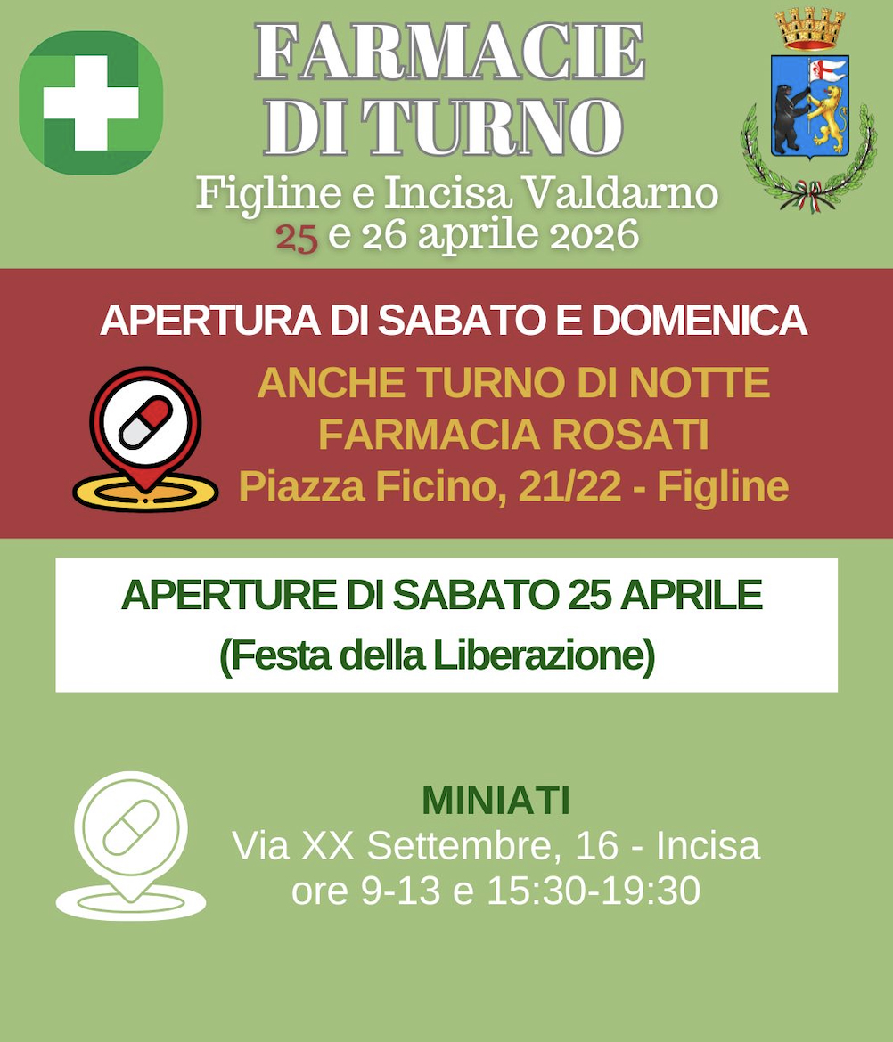 Ecco di seguito le farmacie di turno aperte sabato 25 (Festa della Liberazione) e domenica 26 aprile a Figline e Incisa Valdarno.