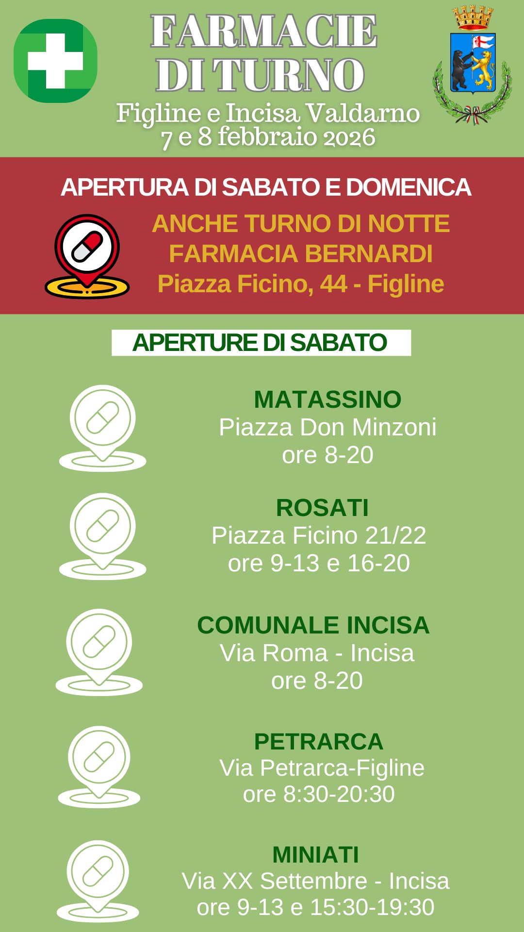 Ecco di seguito le farmacie di turno aperte sabato 7 e domenica 8 febbraio a Figline e Incisa Valdarno.