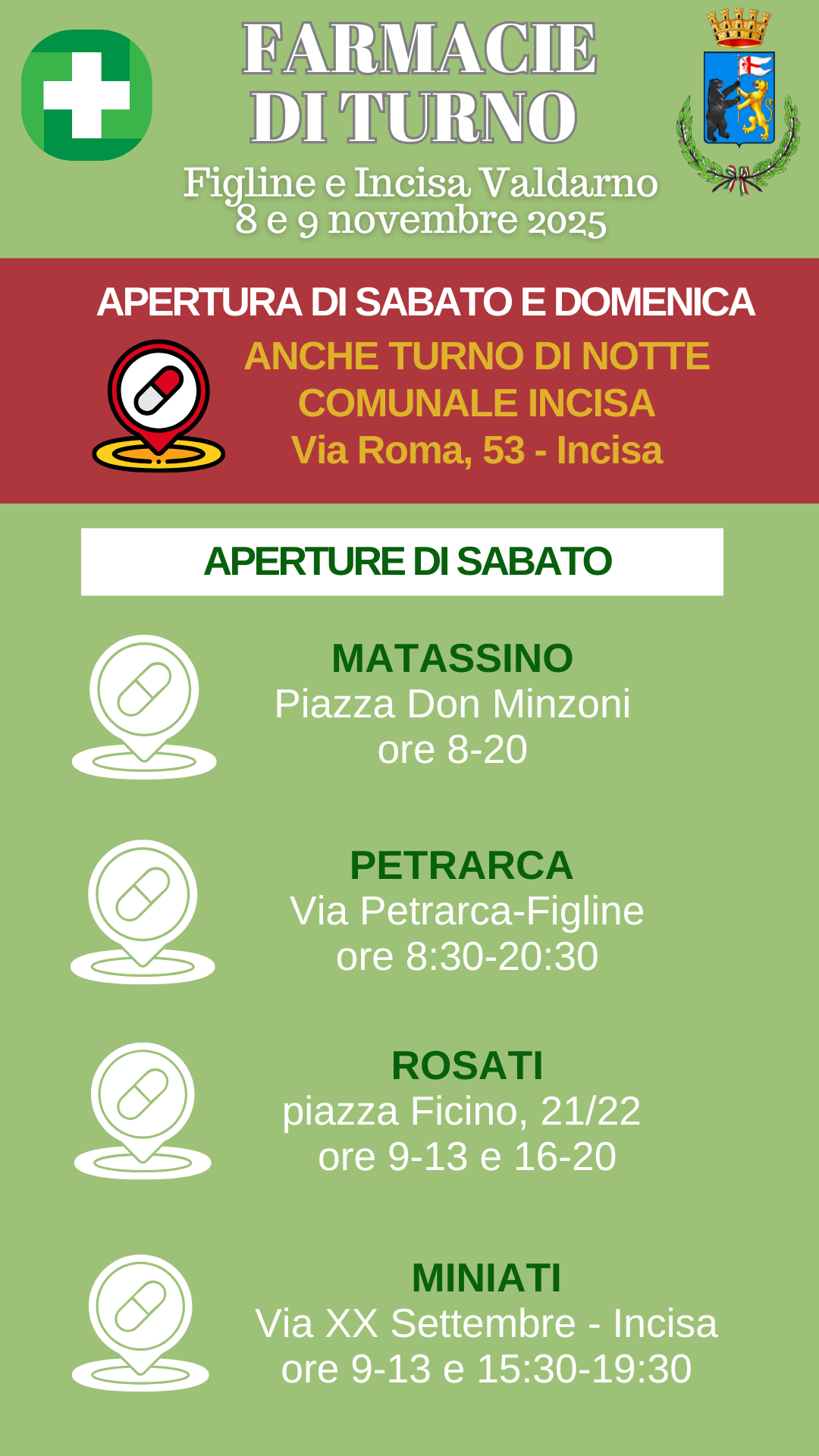 Ecco di seguito le farmacie di turno aperte il fine settimana dell’8 e 9 novembre a Figline e Incisa Valdarno.