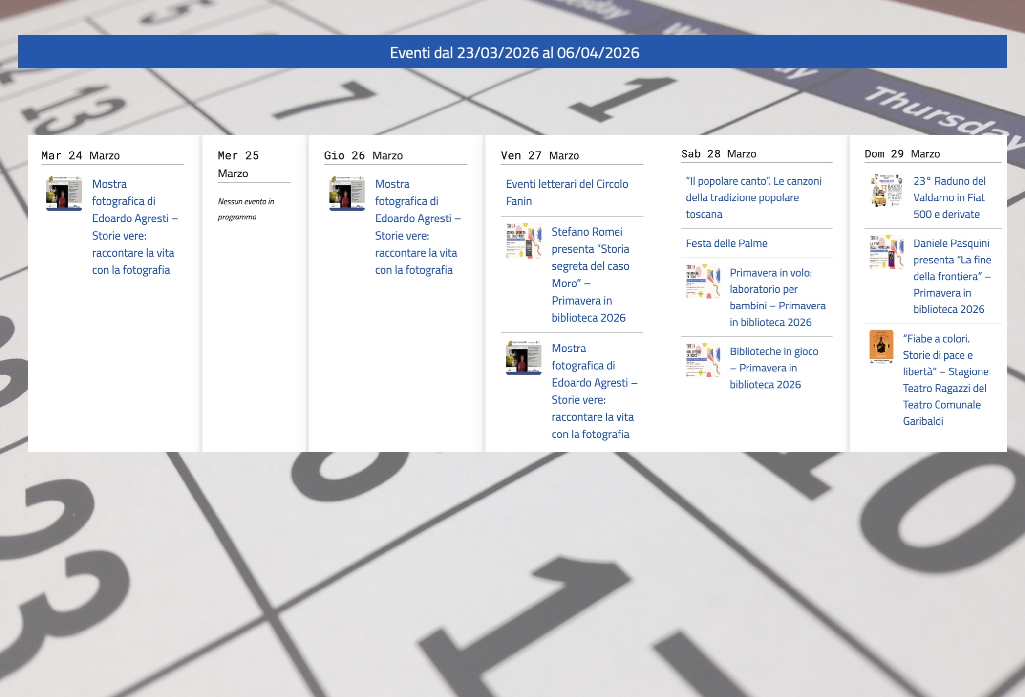 Mostre fotografiche, incontri in biblioteca, canti popolari, raduni di auto d’epoca e la tradizionale festa delle Palme. Sono questi gli appuntamenti della settimana a Figline e Incisa Valdarno, promossi dal Comune o realizzati grazie al suo sostegno. Nel dettaglio, martedì e giovedì dalle 15 alle 17 ed il venerdì dalle 21 alle 23 sarà possibile visitare la mostra di Edoardo Agresti, “Storie vere: raccontare la vita con la fotografia”, allestita nella Galleria Fiaf del Circolo Fotografico Arno (via Roma, 2 a Figline, ingresso gratuito).