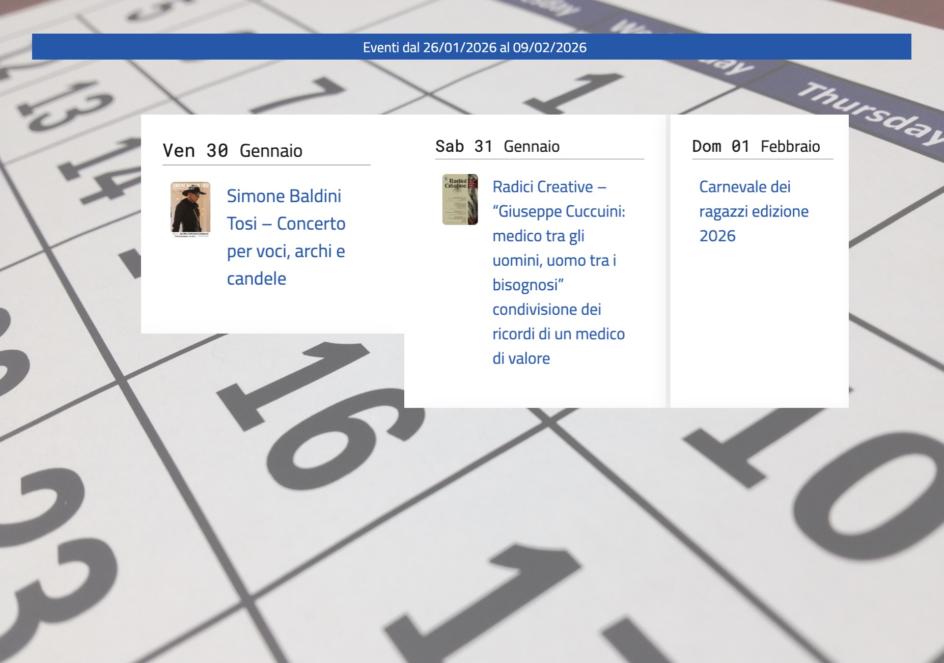 Dolci melodie che si innestano in un’atmosfera intima e fuori dal tempo, incontri commemorativi e appuntamenti legati al Carnevale. Questi gli appuntamenti della settimana a Figline e Incisa Valdarno, promossi dal Comune o realizzati grazie al suo sostegno. Il primo è in programma venerdì 30 gennaio, alle 21, al teatro Garibaldi, dove all’interno del Foyer si terrà il concerto per voci, archi e candele del musicista, autore, cantante e compositore Simone Baldini Tosi. Un appuntamento intimo e coinvolgente, dove la voce dell’artista si fonderà con il suono degli archi in una scenografia calda e suggestiva, illuminata da candele. Il repertorio musicale spazierà tra grandi classici italiani e internazionali, fino a brani originali. Un concerto non solo da ascoltare ma anche da vedere e da sentire dentro, un momento sospeso tra poesia, luce e silenzio. Per i biglietti è possibile recarsi alla biglietteria del teatro, nei punti vendita Box Office Toscana o sulla piattaforma online di TicketOne.