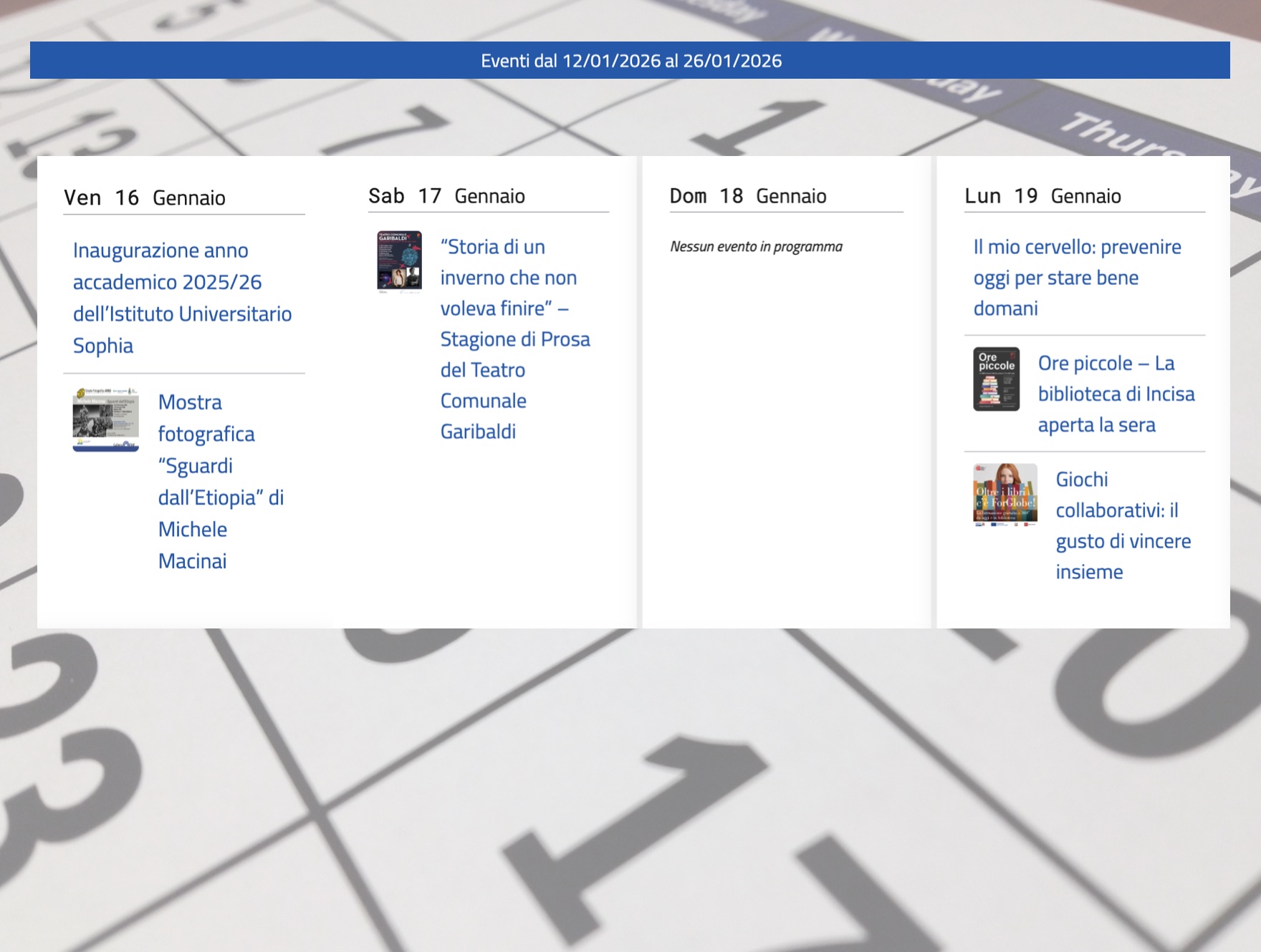 Giochi di società, spettacoli, benessere e molto altro. Si apre una nuova settimana di eventi a Figline e Incisa Valdarno, con appuntamenti promossi dal Comune o realizzati grazie al suo sostegno. Il primo si svolgerà venerdì 16 gennaio, alle 17, nell’Auditorium di Loppiano dove si svolgerà l’inaugurazione dell’anno accademico 2025/2026 dell’Istituto Universitario Sophia, appuntamento che segna l’apertura ufficiale delle attività didattiche. L’appuntamento è aperto a tutti. Interverranno il Gran Cancelliere S. Eccellenza Mons. Gherardo Gambelli, il Vice Gran Cancelliere e Presidente del Movimento dei Focolari, dott.ssa Margaret Karram, la rappresentante degli studenti dott.ssa Candela Copparoni. A seguire relazione del Rettore Professor Declan O’Byrne e la prolusione “Filosofia e sapienza relazionale: formare l’umano per un mondo in trasformazione” di Giuseppe D’anna, Professore Ordinario di Storia della Filosofia all’Università Cattolica del Sacro Cuore di Milano.