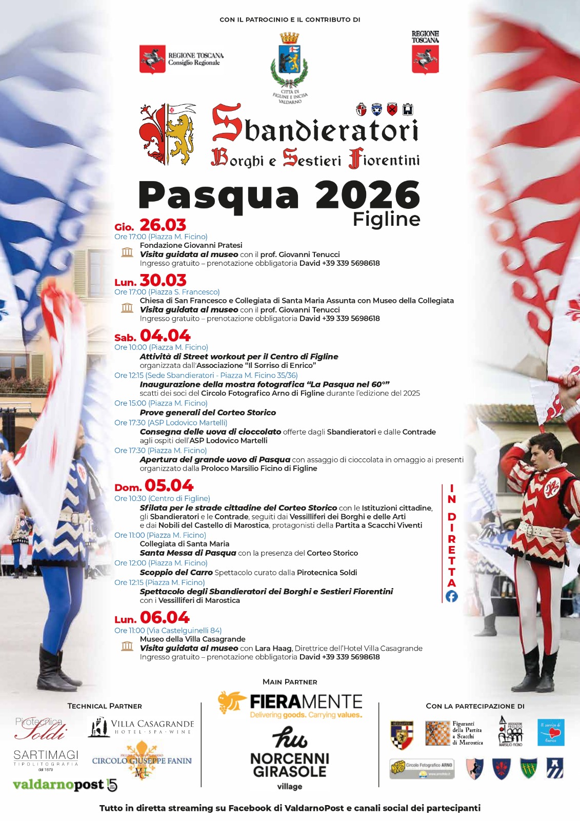 Torna a Figline e Incisa Valdarno uno degli appuntamenti più attesi della Primavera, capace di unire tradizione, spettacolo e partecipazione: le celebrazioni pasquali organizzate dagli Sbandieratori dei Borghi e Sestieri Fiorentini, con il patrocinio ed il contributo del Comune di Figline e Incisa Valdarno e della Regione Toscana, e la collaborazione di Proloco Marsilio Ficino, Compagnia delle Contrade di Figline, Villa Casagrande, Pirotecnica Soldi, Associazione Il Sorriso di Enrico e Circolo Fotografico Arno.