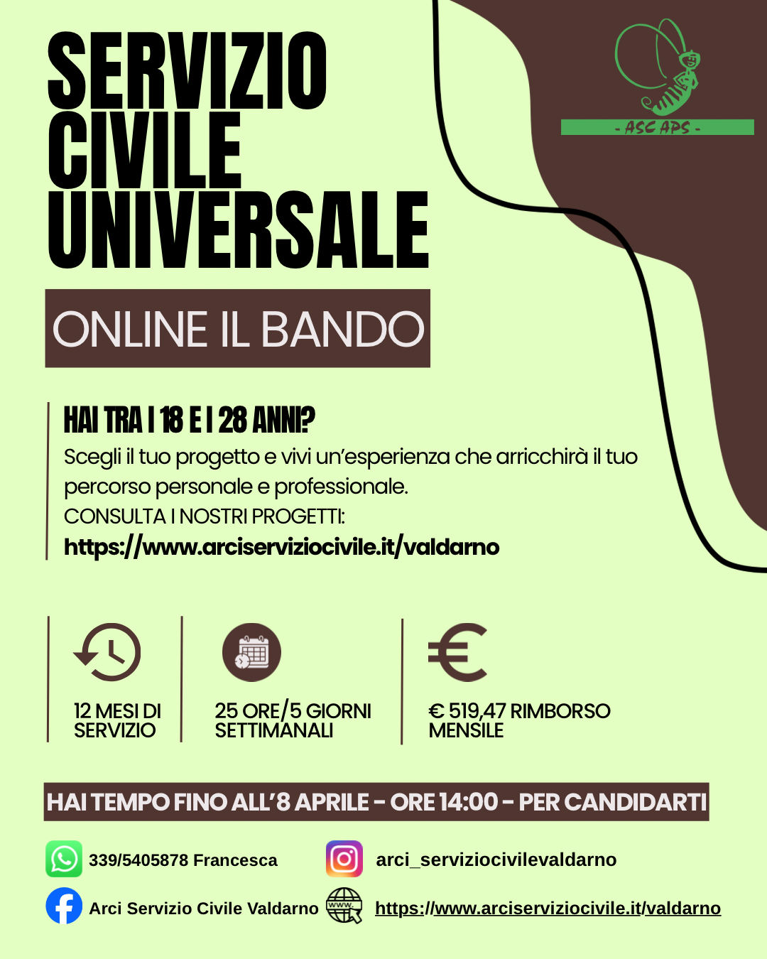 Per informazioni è possibile contattare Arci Valdarno tramite i seguenti canali: telefono (3395405878 Francesca, anche WhatsApp), Facebook (Arci Servizio Civile Valdarno), Instagram (@arci_serviziocivilevaldarno), web