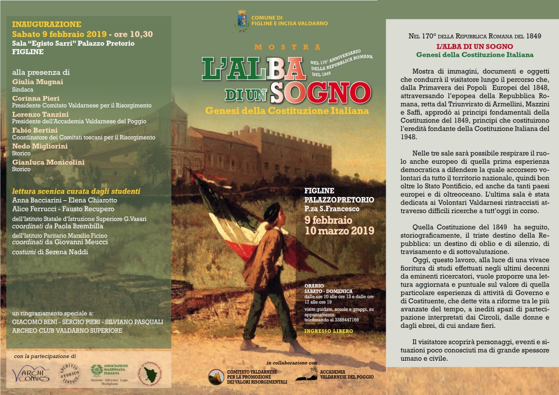 Fa parte di un progetto a tema Memoria e Cittadinanza la mostra “L’alba di un sogno”, in corso al Palazzo Pretorio di Figline dove rimarrà allestita fino al 10 marzo. A 170 anni dalla Repubblica Romana del 1849 (che può esser considerata la genesi della Costituzione Italiana), l’idea è quella di ripercorrerne la storia attraverso immagini, documenti e oggetti, in modo da rendere consapevoli i visitatori (specie quelli più giovani) di quali sono state le tappe fondamentali che hanno contribuito a portare avanti idee e valori democratici.
